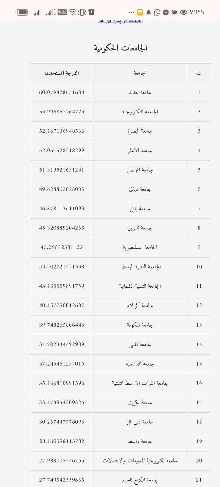 وذكرت دائرة الإعلام والاتصال الحكومي في وزارة التعليم العالي والبحث ان هذا التصنيف جاء استناداً إلى تقييم شامل شمل أكثر من مئة جامعة حكومية وأهلية، وفق محددات البيئة التعليمية ومؤشرات الأداء المؤسسي ومسار البحث العلمي، وبإشراف جهاز الإشراف والتقويم العلمي في الوزارة.واعتمدت نسخة التصنيف لهذا العام على تسعة محاور رئيسة لقياس الأداء المؤسسي، تمثلت في: معايير الاعتماد المؤسسي (15%)، والتصنيفات العالمية (10%)، وفاعلية البحث العلمي (35%)، والتنمية المستدامة والمؤشرات الخضراء (10%)، وتقييم الواقع العلمي والأكاديمي وقواعد الامتثال (5%)، والجوائز (5%)، والتنوع الدولي (10%)، والصحة والسلامة المهنية والمحافظة على البيئة (5%)، فضلاً عن الأنشطة الجامعية (5%).وأظهرت نتائج التصنيف حصول جامعة بغداد على المرتبة الأولى على مستوى الجامعات الحكومية، تلتها الجامعة التكنولوجية ثم جامعة البصرة، فيما حققت جامعة المستقبل المرتبة الأولى على مستوى الجامعات الأهلية، وجاءت جامعة وارث الأنبياء ثانية، تليها الجامعة الإسلامية في المرتبة الثالثة.ويُعد هذا الإنجاز تأكيداً على المسار التصاعدي لجامعة واسط في تعزيز جودة التعليم العالي، وتطوير البحث العلمي، والالتزام بمعايير الاعتماد والجودة المؤسسية.